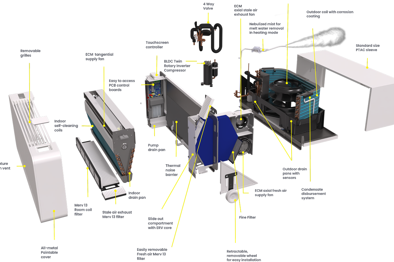 Nextac’s Model P is the quiet PTAC alternative that finally solves the problems of older units. With a slim, modern design, it cuts the bulk and the noise while keeping rooms comfortable and efficient. By reducing air leakage and heat loss, it lowers energy waste and maintains steady conditions. An inverter compressor and integrated ERV recover lost heat to ensure consistent comfort without distraction.